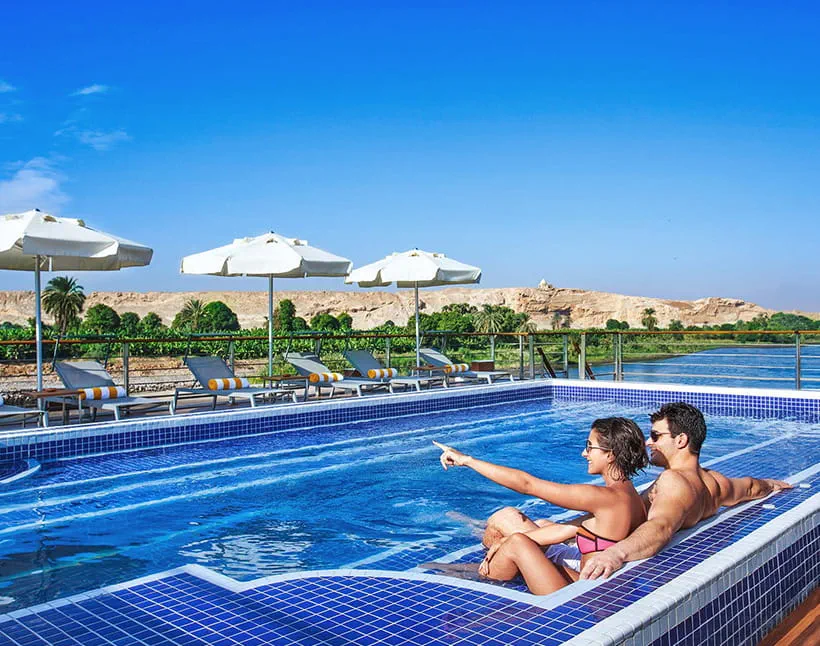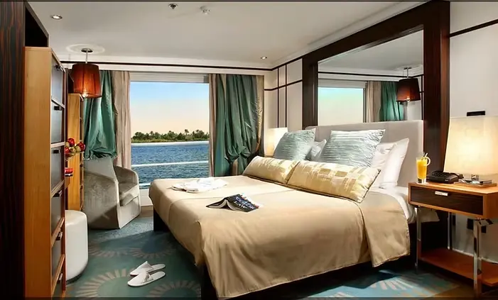 Todas las cabinas cuentan con ventanas panorámicas, aire acondicionado, mini-bar, caja fuerte, teléfono, secador de pelo y baño privado con bañera, garantizando el máximo confort durante la navegación. A bordo, los huéspedes disfrutan de restaurante, salón, piscina exterior con bar, servicio a la habitación, entretenimiento nocturno y excursiones guiadas a los templos y sitios históricos más destacados de Egipto.