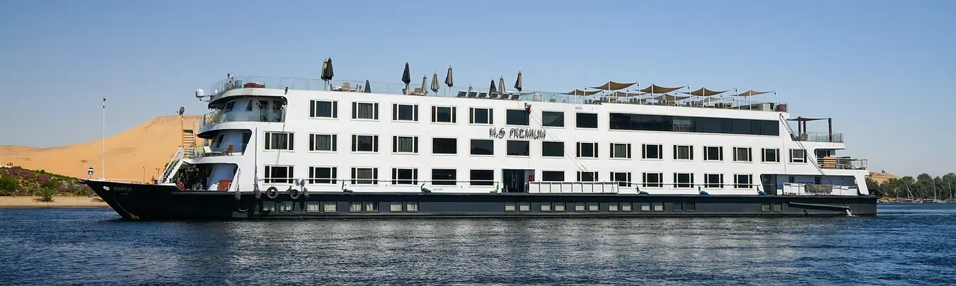 El MS Nile Premium es un crucero de 5 cubiertas que cuenta con 60 habitaciones completamente equipadas, incluyendo aire acondicionado, televisión por satélite, teléfono con llamadas internacionales, mini-bar, secador de pelo y baño privado, garantizando comodidad y lujo durante todo el viaje.