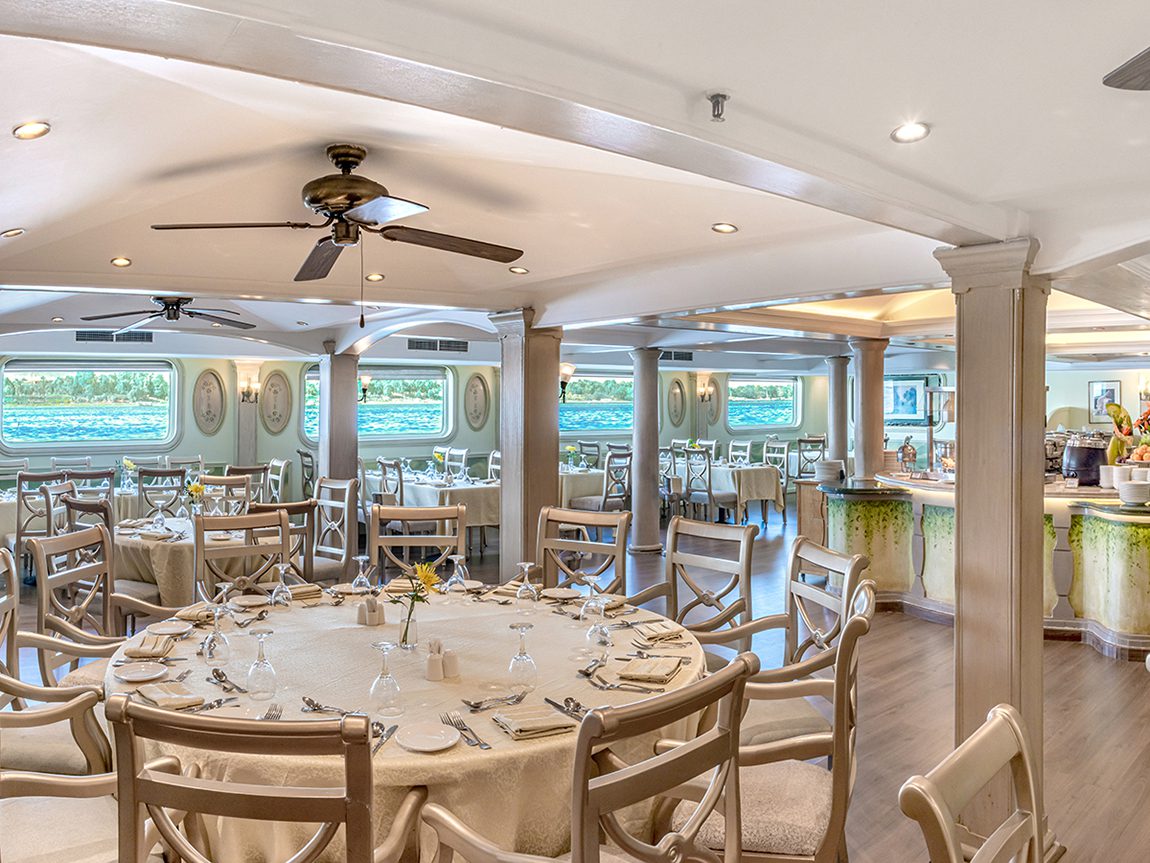 Disfruta de tus comidas mientras el crucero te ofrece comodidad, lujo y vistas espectaculares del Nilo.