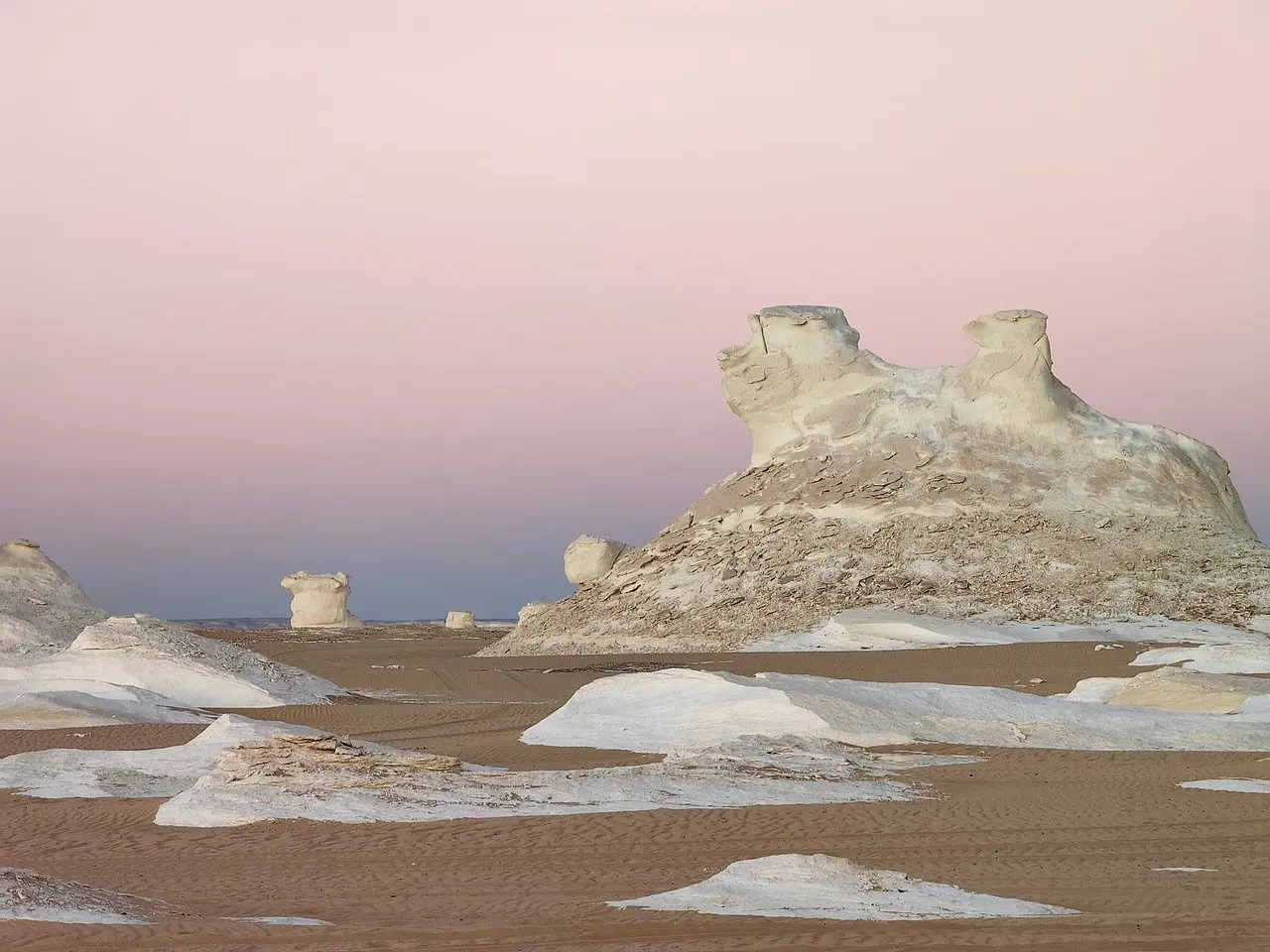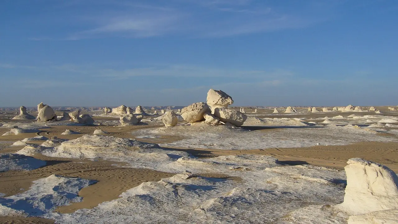 Explora el Desierto Blanco, un paisaje que parece la superficie de la luna con arena blanca como nieve. Captura la puesta de sol y observa formaciones rocosas únicas en formas de cabezas humanas, hongos y plantas.