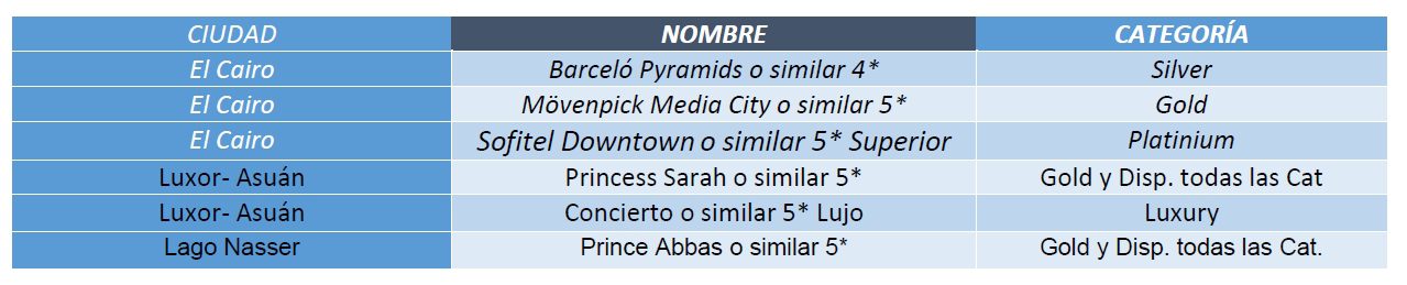 • Consultar disponibilidad y costos adicionales para excursiones opcionales, crucero por el Nilo y visitas al Lago Nasser.