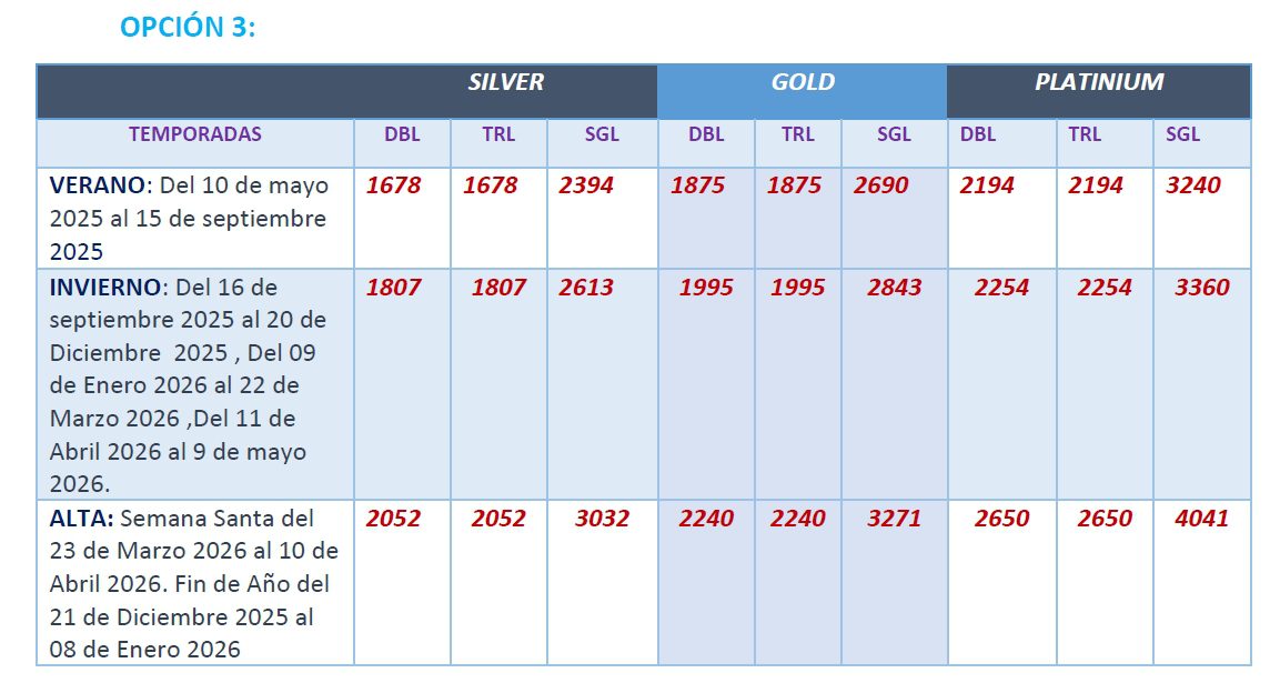 ❌ Propinas durante el crucero: Silver/Gold 60 USD, Platinum 110 USD.