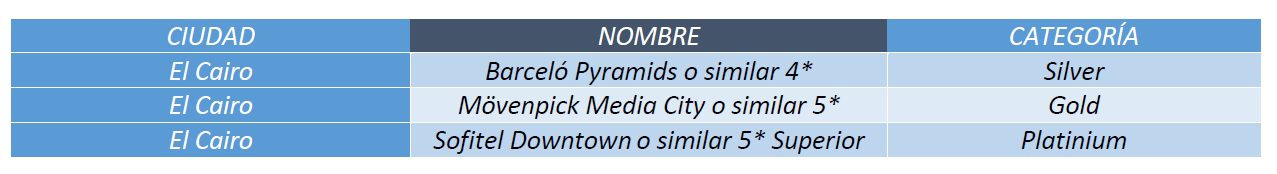Fechas especiales: En Nochebuena (23–24 de diciembre de 2025) y Nochevieja (31 de diciembre de 2025 – 01 de enero de 2026) podría existir una Cena de Gala obligatoria en hoteles de la categoría 5★ Superior (Platinum) dentro o fuera de El Cairo.