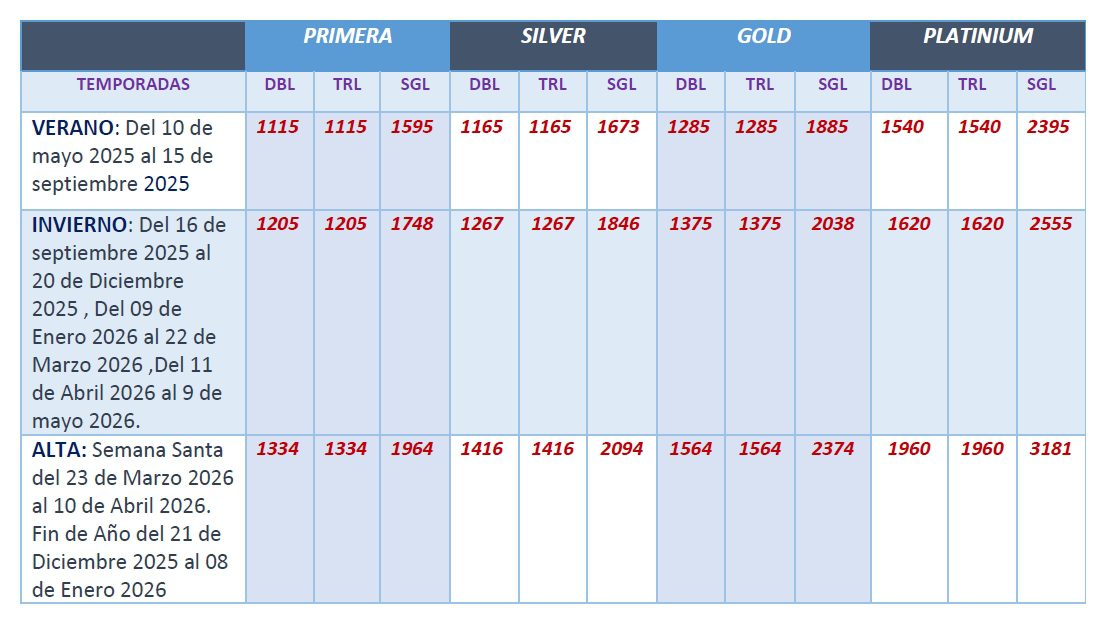 • Durante Nochebuena (23–24 dic 2025) y Nochevieja (31 dic 2025 – 1 ene 2026), algunos hoteles 5★ Superior Platinum pueden requerir Cena de Gala obligatoria.