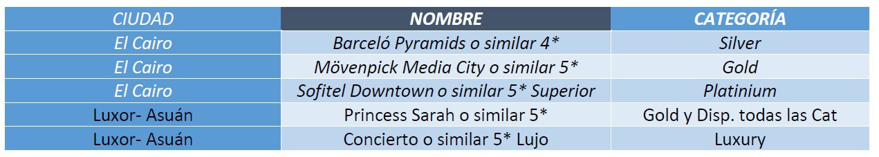 Viaje a Egipto por 9 Días: hoteles según la categoría del programa, con opciones estándar, lujo y lujo superior.