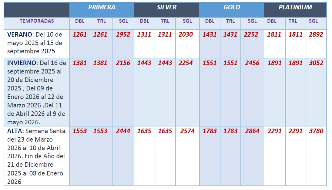 Durante Nochebuena (23–24 Dic 2025) y Nochevieja (31 Dic–01 Ene 2026), algunos hoteles 5★ Superior pueden aplicar cenas de gala obligatorias. Consultar el suplemento correspondiente.