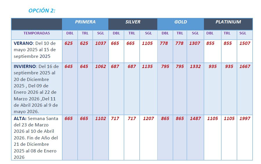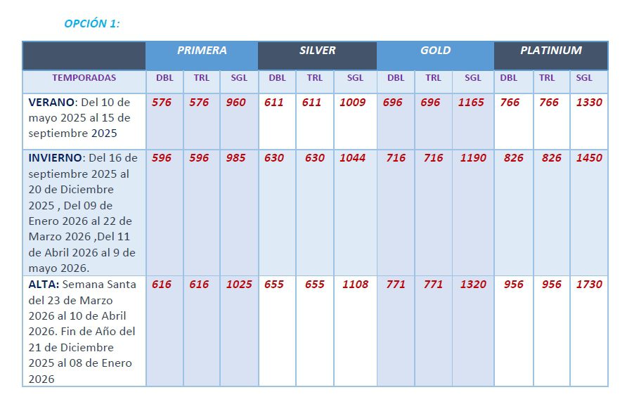 Durante las fechas especiales de Nochebuena (23–24 dic 2025) y Nochevieja (31 dic 2025–1 ene 2026), algunos hoteles 5★ Superior (Platinum) podrían ofrecer Cena de Gala obligatoria, la cual no está incluida en el precio inicial.